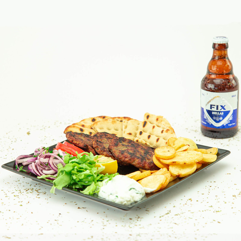 Bifteki grecesc la farfurie, contine carne vita-porc.